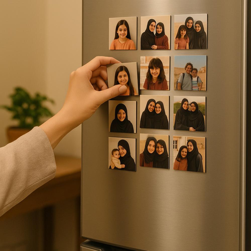نحوّل لحظاتك الجميلة إلى صور مغناطيسية بحجم 5×5 سم، تُصنع يدويًا بعناية، وتُستخدم على الأسطح المعدنية أو تُثبت بسهولة على غير المعدنية — مثل التسريحة، مكتب العمل، السيارة، أو أي مكان تحبين تزيينه.